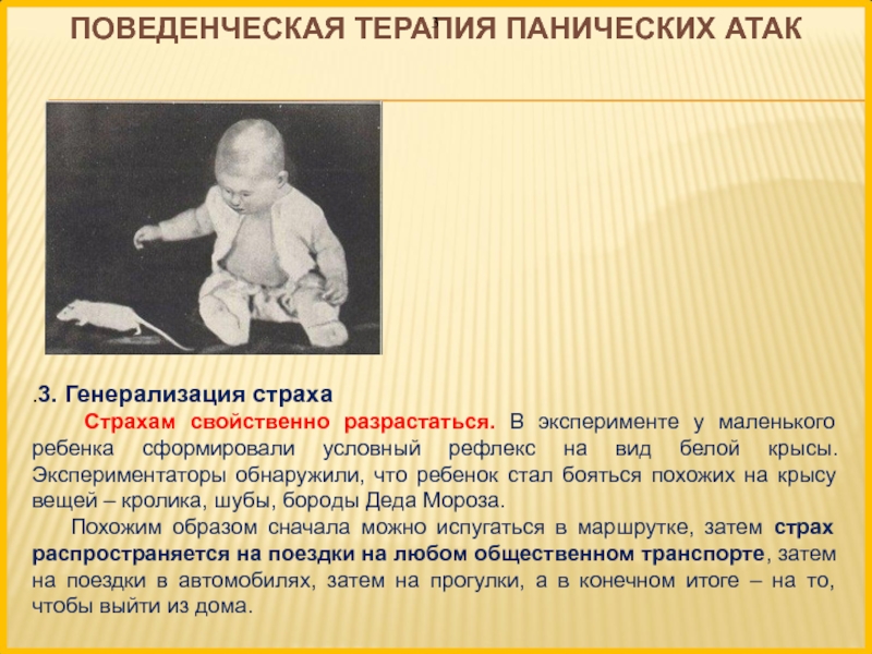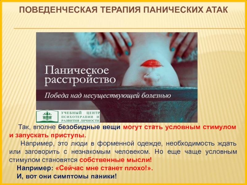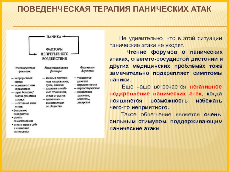 Он исследует систему подкрепления панических атак, помогает сформировать систему подкреплений здорового поведения и устранить «подкрепители» панических атак.