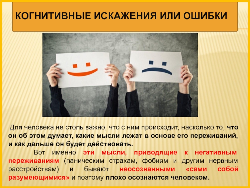 Незаметно для себя мы постоянно строим предположения и догадки о мире и относимся к жизни на основании своих оценок. Другими словами, мы видим мир не таким каков он есть, а таким, каким мы видим его. То есть то, как мы интерпретируем мир, оказывает огромное значение на нашу реакцию на различные события.