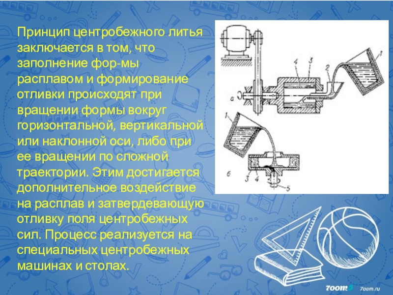 Слайд 7Принцип центробежного литья заключается в том, что заполнение фор-мы расплавом и