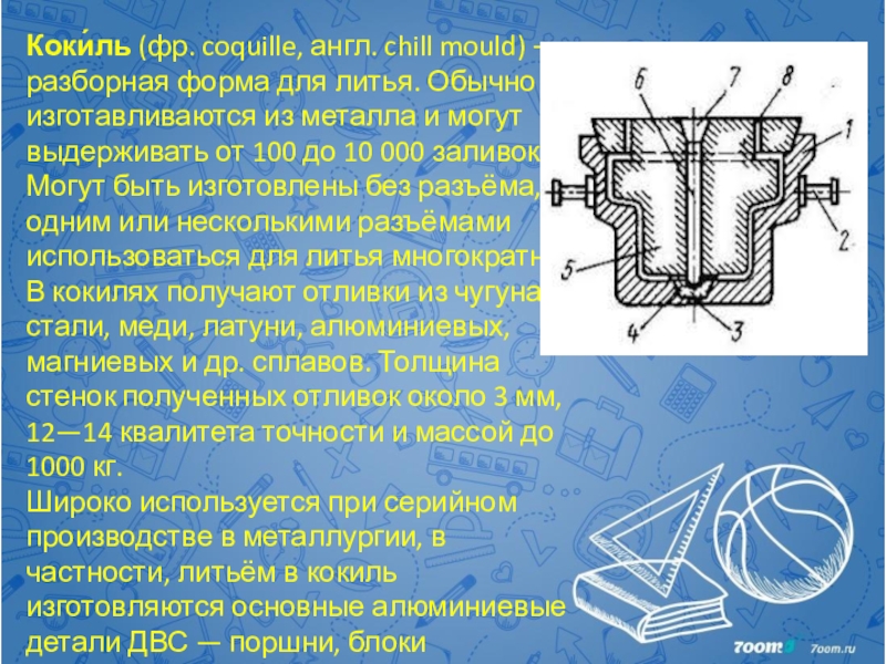 Слайд 6Коки́ль (фр. coquille, англ. chill mould) — разборная форма для литья.