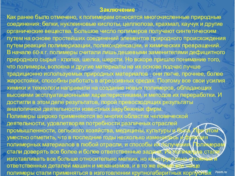 нуклеиновые кислоты, целлюлоза, крахмал, каучук и другие органические вещества. Большое число полимеров получают синтетическим путем на основе простейших соединений элементов природного происхождения путем реакций полимеризации, поликонденсации, и химических превращений.