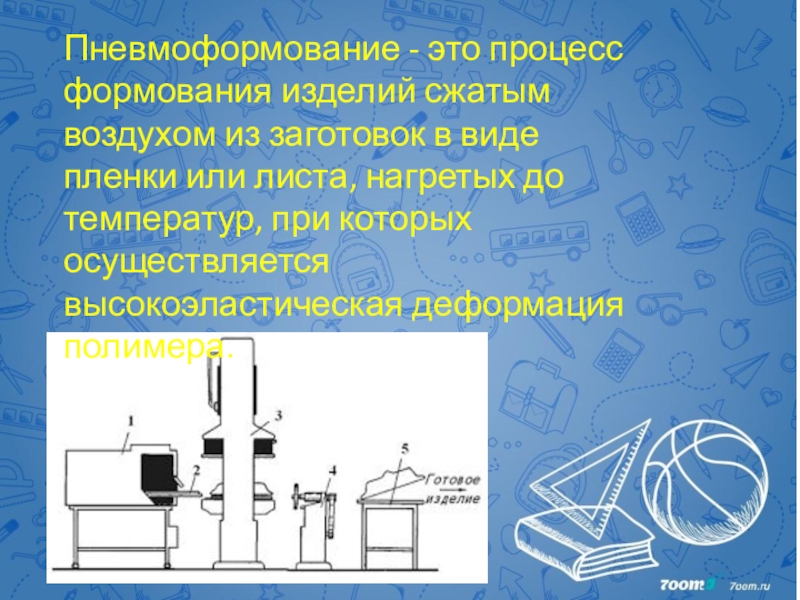 Слайд 14Пневмоформование - это процесс формования изделий сжатым воздухом из заготовок в