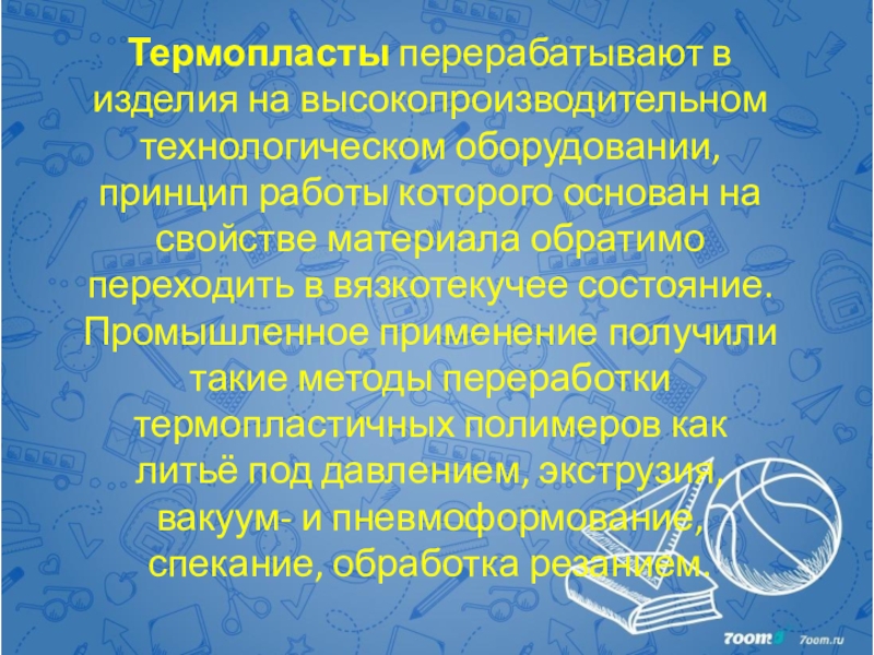 Слайд 2Термопласты перерабатывают в изделия на высокопроизводительном технологическом оборудовании, принцип работы которого