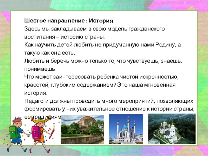 Педагоги должны проводить много мероприятий, позволяющих формировать у них уважительное отношение к истории страны, ее традициям.