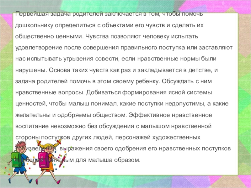 объектами его чувств и сделать их общественно ценными. Чувства позволяют человеку испытать удовлетворение после совершения правильного поступка или заставляют нас испытывать угрызения совести, если нравственные нормы были нарушены. Основа таких чувств как раз и закладывается в детстве, и задача родителей помочь в этом своему ребенку. Обсуждать с ним нравственные вопросы. Добиваться формирования ясной системы ценностей, чтобы малыш понимал, какие поступки недопустимы, а какие желательны и одобряемы обществом. Эффективное нравственное воспитание невозможно без обсуждения с малышом нравственной стороны поступков других людей, персонажей художественных произведений, выражения своего одобрения его нравственных поступков наиболее понятным для малыша образом.