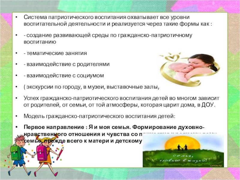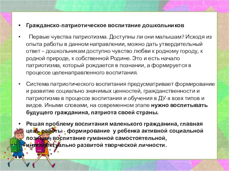 Система патриотического воспитания предусматривает формирование и развитие социально значимых ценностей, гражданственности и патриотизма в процессе воспитания и обучения в ДУ-х всех типов и видов. Иными словами, на современном этапе нужно воспитывать будущего гражданина, патриота своей страны.