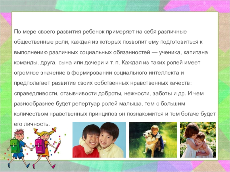 каждая из которых позволит ему подготовиться к выполнению различных социальных обязанностей — ученика, капитана команды, друга, сына или дочери и т. п. Каждая из таких ролей имеет огромное значение в формировании социального интеллекта и предполагает развитие своих собственных нравственных качеств: справедливости, отзывчивости доброты, нежности, заботы и др. И чем разнообразнее будет репертуар ролей малыша, тем с большим количеством нравственных принципов он познакомится и тем богаче будет его личность.