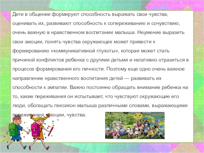 Дети в общении формируют способность выражать свои чувства, оценивать их, развивают