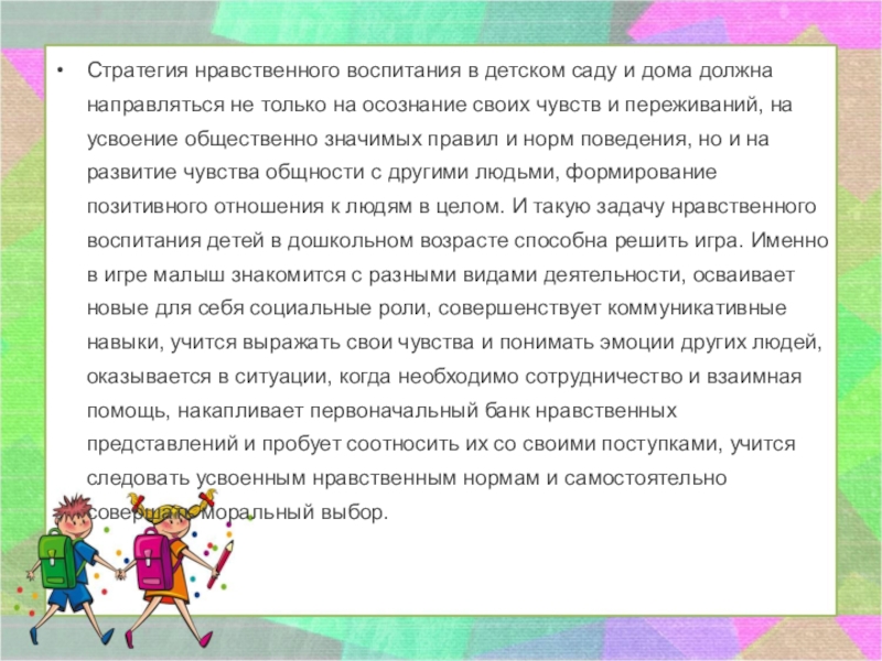 только на осознание своих чувств и переживаний, на усвоение общественно значимых правил и норм поведения, но и на развитие чувства общности с другими людьми, формирование позитивного отношения к людям в целом. И такую задачу нравственного воспитания детей в дошкольном возрасте способна решить игра. Именно в игре малыш знакомится с разными видами деятельности, осваивает новые для себя социальные роли, совершенствует коммуникативные навыки, учится выражать свои чувства и понимать эмоции других людей, оказывается в ситуации, когда необходимо сотрудничество и взаимная помощь, накапливает первоначальный банк нравственных представлений и пробует соотносить их со своими поступками, учится следовать усвоенным нравственным нормам и самостоятельно совершать моральный выбор.