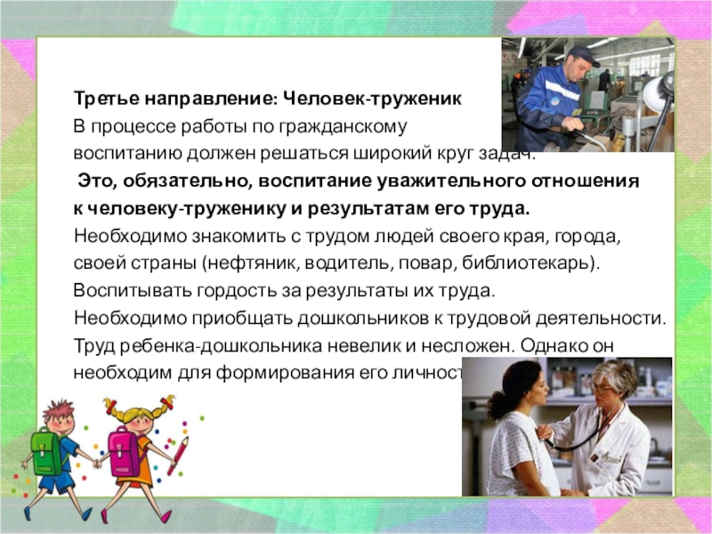 Необходимо знакомить с трудом людей своего края, города, своей страны (нефтяник, водитель, повар, библиотекарь). Воспитывать гордость за результаты их труда.