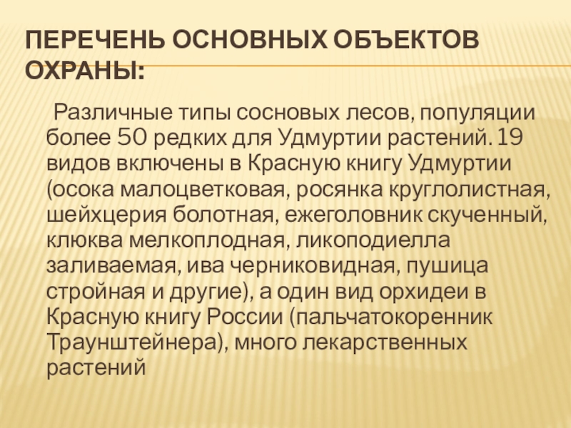 для Удмуртии растений. 19 видов включены в Красную книгу Удмуртии (осока малоцветковая, росянка круглолистная, шейхцерия болотная, ежеголовник скученный, клюква мелкоплодная, ликоподиелла заливаемая, ива черниковидная, пушица стройная и другие), а один вид орхидеи в Красную книгу России (пальчатокоренник Траунштейнера), много лекарственных растений