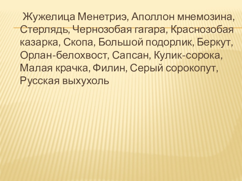 Слайд 16 Жужелица Менетриэ, Аполлон мнемозина, Стерлядь, Чернозобая гагара, Краснозобая казарка, Скопа, Большой