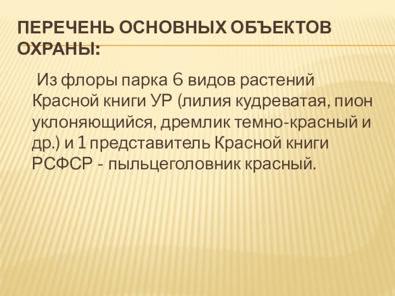 УР (лилия кудреватая, пион уклоняющийся, дремлик темно-красный и др.) и 1 представитель Красной книги РСФСР - пыльцеголовник красный.