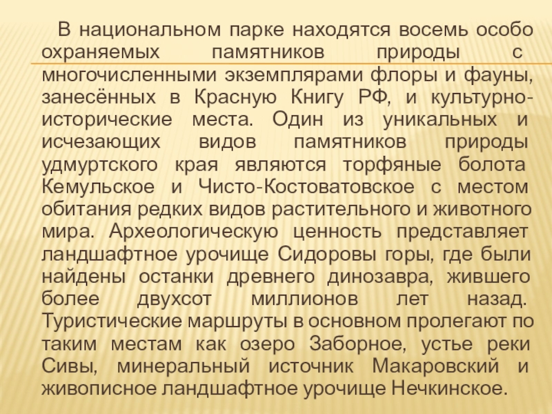природы с многочисленными экземплярами флоры и фауны, занесённых в Красную Книгу РФ, и культурно-исторические места. Один из уникальных и исчезающих видов памятников природы удмуртского края являются торфяные болота Кемульское и Чисто-Костоватовское с местом обитания редких видов растительного и животного мира. Археологическую ценность представляет ландшафтное урочище Сидоровы горы, где были найдены останки древнего динозавра, жившего более двухсот миллионов лет назад. Туристические маршруты в основном пролегают по таким местам как озеро Заборное, устье реки Сивы, минеральный источник Макаровский и живописное ландшафтное урочище Нечкинское.