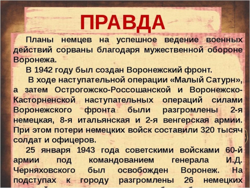 Презентация, доклад на тему Освобождение Воронежа от фашистских захватчиков