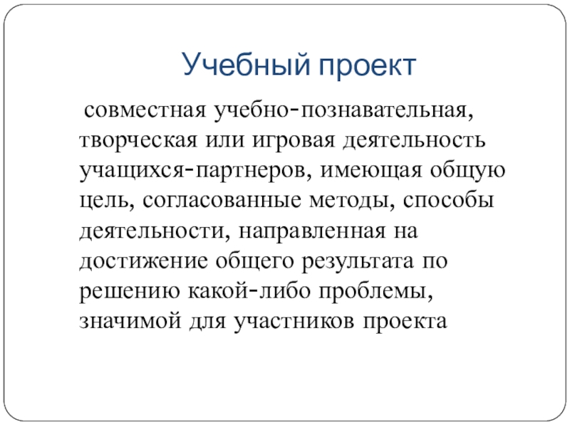 Учебный проект  совместная учебно-познавательная, творческая или игровая деятельность учащихся-партнеров, имеющая общую цель, согласованные методы, способы деятельности, направленная