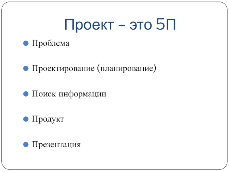 Проект – это 5ППроблемаПроектирование (планирование)Поиск информацииПродуктПрезентация