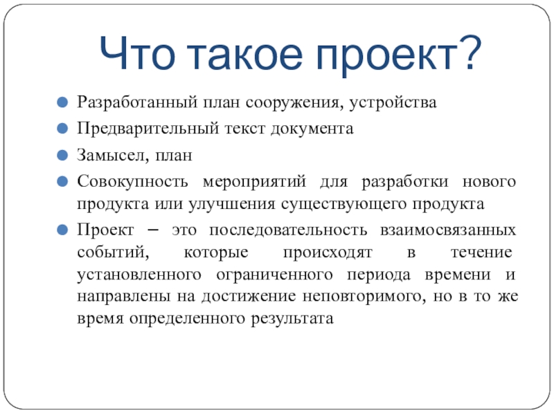 Что такое проект?Разработанный план сооружения, устройстваПредварительный текст документаЗамысел, планСовокупность мероприятий для разработки нового продукта или улучшения существующего