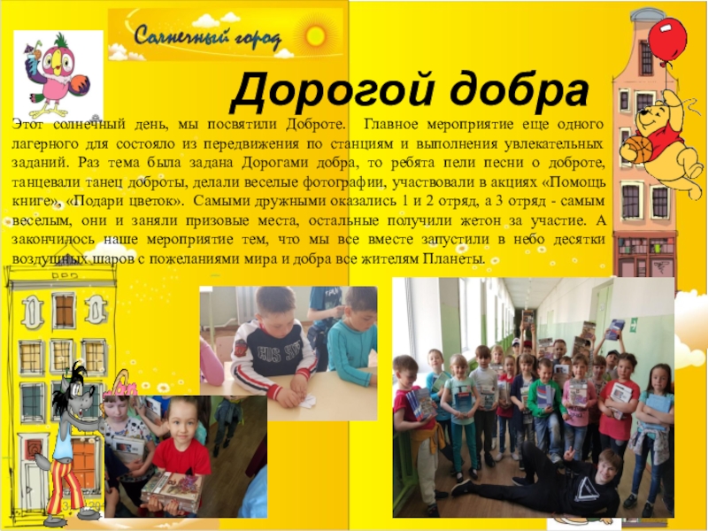 Вот и настало время открытия пришкольных лагерей. В этот день, а именно 1 июня в день защиты детей, наша школа распахнула двери для девчонок и мальчишек. В этот день мы побывали в гостях у Веселинки, где веселились, бегали, прыгали, знакомились,…. Получили огромный заряд бодрости и радости, а закончился наш день зажигательной дискотекой, посвященной празднику «Дню защиты детей».