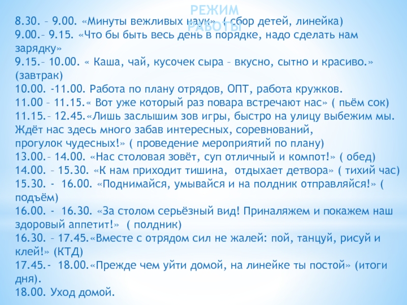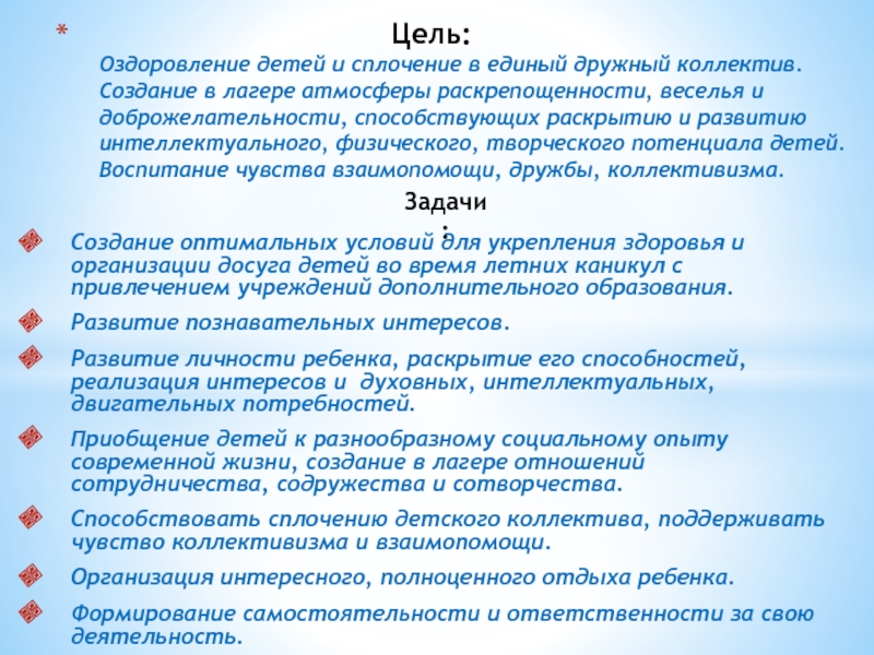 Создание в лагере атмосферы раскрепощенности, веселья и доброжелательности, способствующих раскрытию и развитию интеллектуального, физического, творческого потенциала детей.