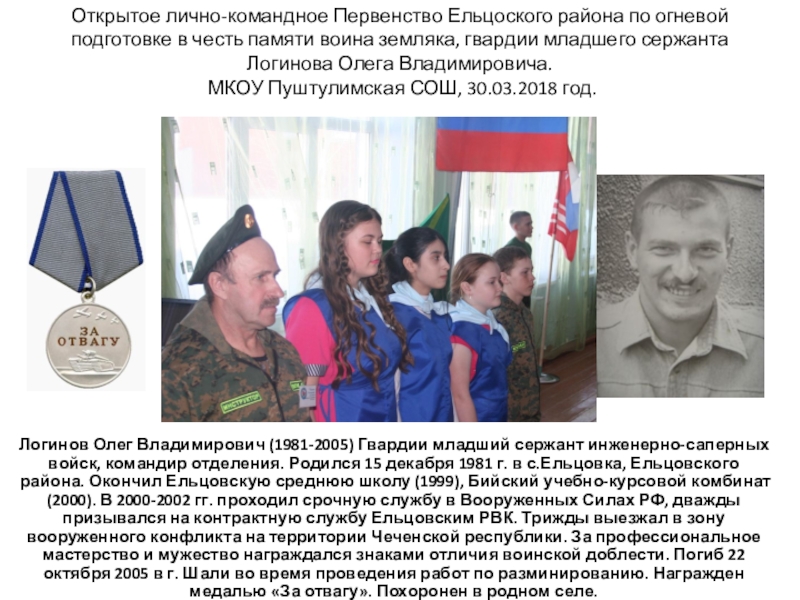 Логинов Олег Владимирович (1981-2005) Гвардии младший сержант инженерно-саперных войск, командир отделения. Родился 15 декабря 1981 г. в с.Ельцовка, Ельцовского района. Окончил Ельцовскую среднюю школу (1999), Бийский учебно-курсовой комбинат (2000). В 2000-2002 гг. проходил срочную службу в Вооруженных Силах РФ, дважды призывался на контрактную службу Ельцовским РВК. Трижды выезжал в зону вооруженного конфликта на территории Чеченской республики. За профессиональное мастерство и мужество награждался знаками отличия воинской доблести. Погиб 22 октября 2005 в г. Шали во время проведения работ по разминированию. Награжден медалью «За отвагу». Похоронен в родном селе.