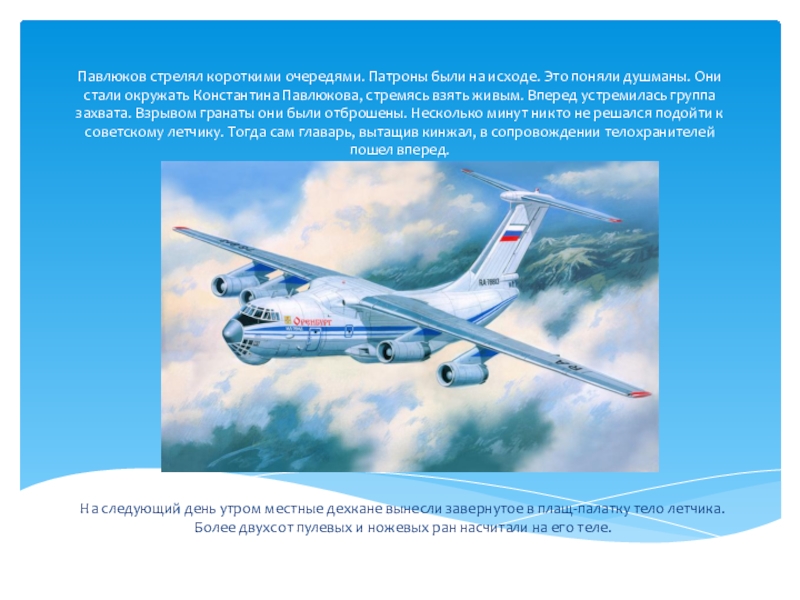 На следующий день утром местные дехкане вынесли завернутое в плащ-палатку тело летчика. Более двухсот пулевых и ножевых ран насчитали на его теле.