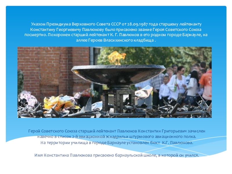 Герой Советского Союза старший лейтенант Павлюков Константин Григорьевич зачислен навечно в список 2-й авиационной эскадрильи штурмового авиационного полка.