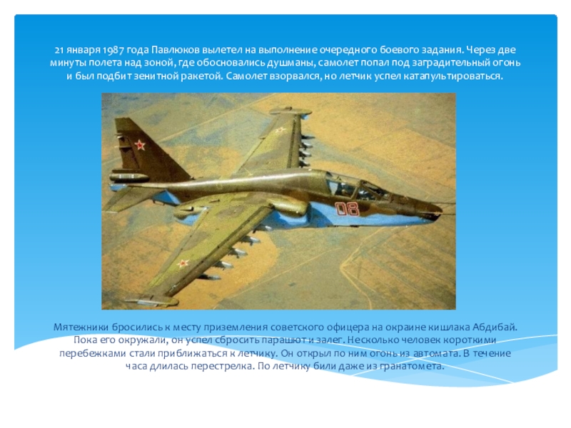 Мятежники бросились к месту приземления советского офицера на окраине кишлака Абдибай. Пока его окружали, он успел сбросить парашют и залег. Несколько человек короткими перебежками стали приближаться к летчику. Он открыл по ним огонь из автомата. В течение часа длилась перестрелка. По летчику били даже из гранатомета.