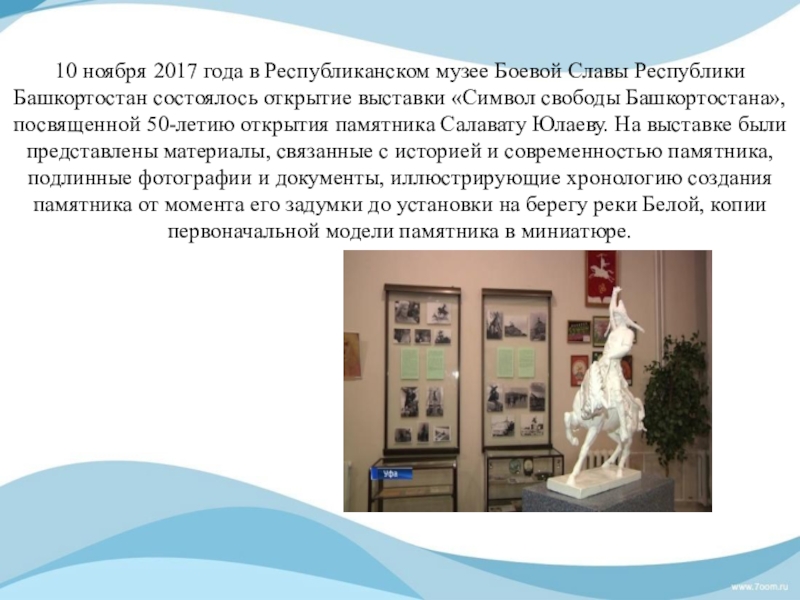 состоялось открытие выставки «Символ свободы Башкортостана», посвященной 50-летию открытия памятника Салавату Юлаеву. На выставке были представлены материалы, связанные с историей и современностью памятника, подлинные фотографии и документы, иллюстрирующие хронологию создания памятника от момента его задумки до установки на берегу реки Белой, копии первоначальной модели памятника в миниатюре.