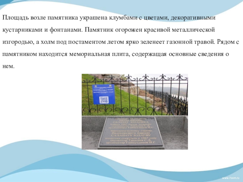 Площадь возле памятника украшена клумбами с цветами, декоративными кустарниками и фонтанами.