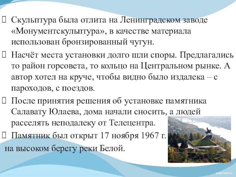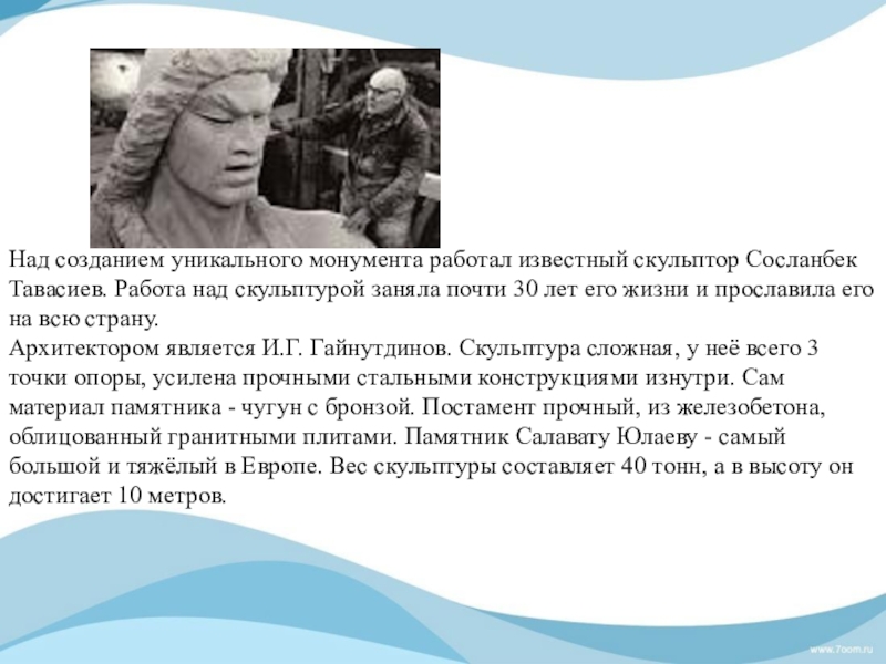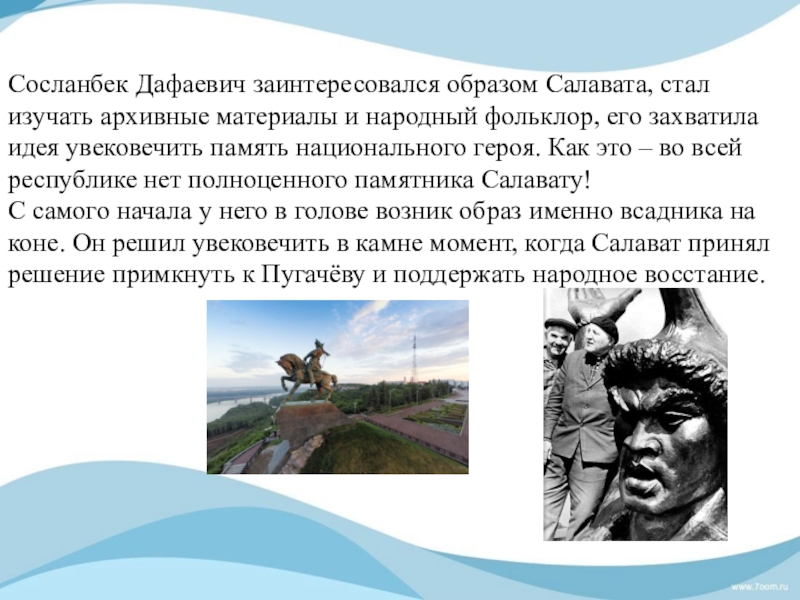 фольклор, его захватила идея увековечить память национального героя. Как это – во всей республике нет полноценного памятника Салавату!