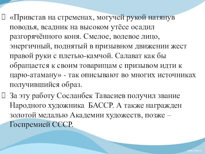осадил разгорячённого коня. Смелое, волевое лицо, энергичный, поднятый в призывном движении жест правой руки с плетью-камчой. Салават как бы обращается к своим товарищам с призывом идти к царю-атаману» - так описывают во многих источниках получившийся образ.