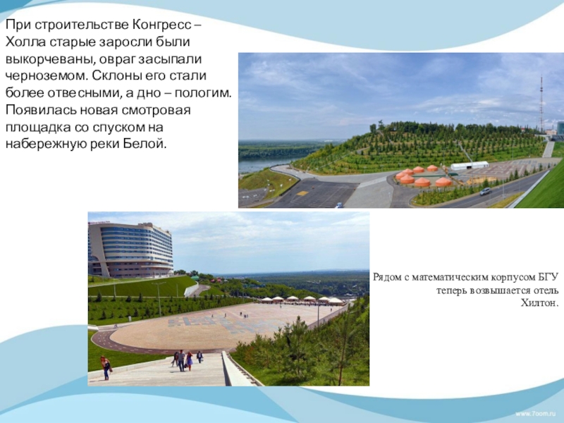 При строительстве Конгресс – Холла старые заросли были выкорчеваны, овраг засыпали черноземом. Склоны его стали более отвесными, а дно – пологим. Появилась новая смотровая площадка со спуском на набережную реки Белой.