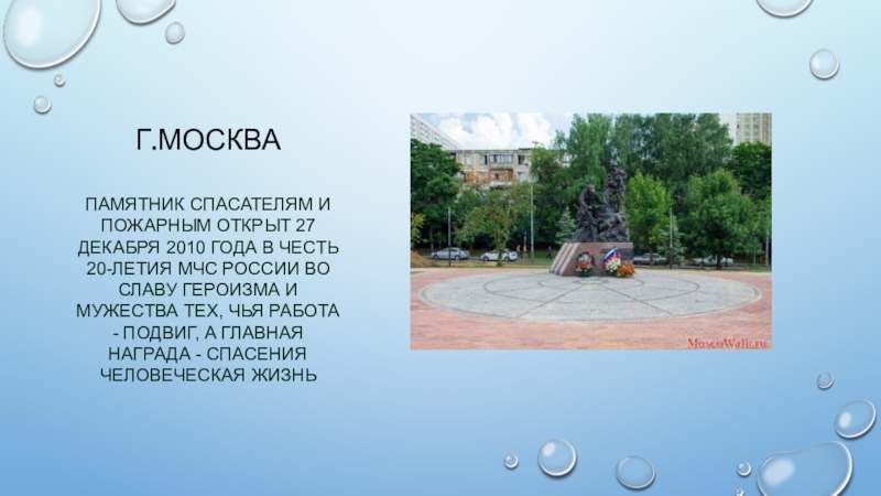 Г.Москва Памятник спасателям и пожарным открыт 27 декабря 2010 года в честь 20-летия МЧС России во славу