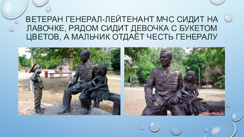 Слайд 7Ветеран генерал-лейтенант МЧС сидит на лавочке, рядом сидит девочка с букетом