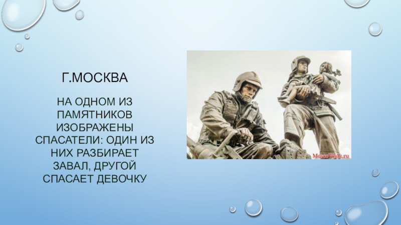 Г.Москва На одном из памятников изображены спасатели: один из них разбирает завал, другой спасает девочку