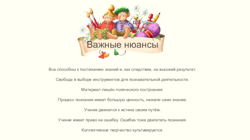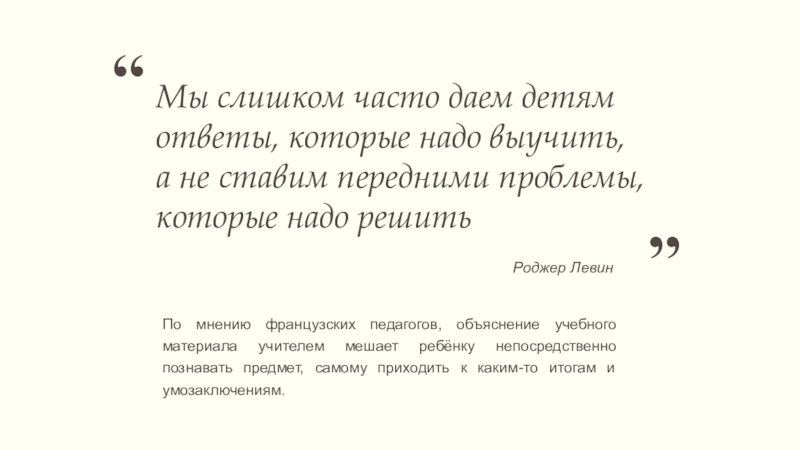 По мнению французских педагогов, объяснение учебного материала учителем мешает ребёнку непосредственно познавать предмет, самому приходить к каким-то итогам и умозаключениям.