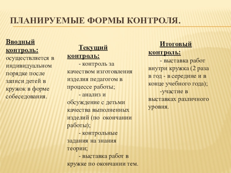 Вводный контроль: осуществляется в индивидуальном порядке после записи детей в кружок в форме собеседования.