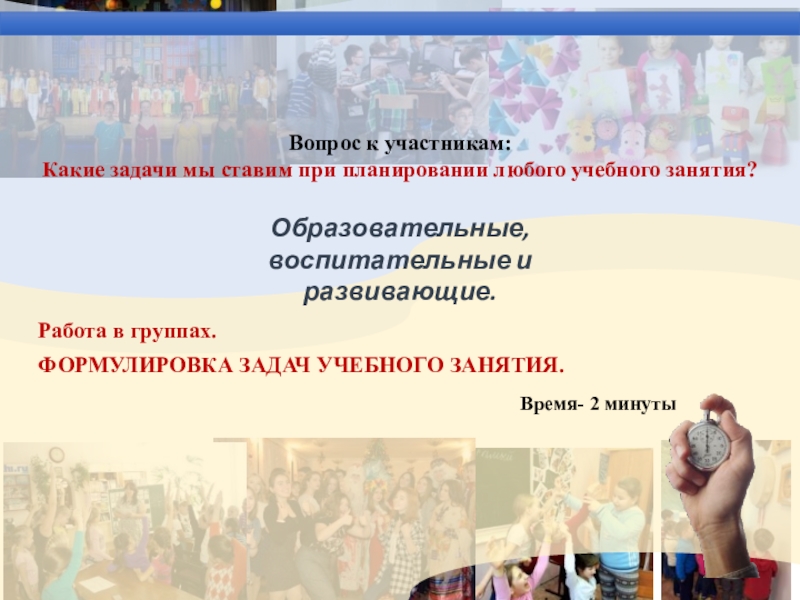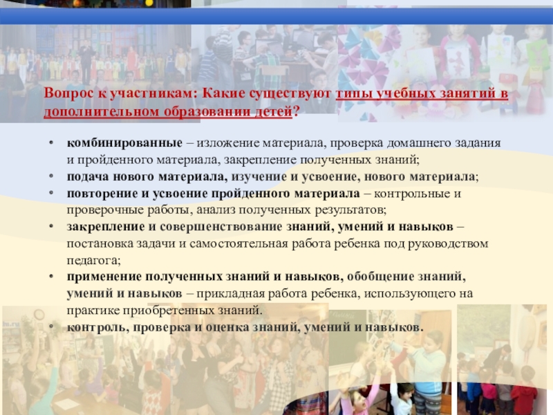 Слайд 18Вопрос к участникам: Какие существуют типы учебных занятий в дополнительном образовании