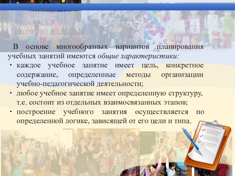 Слайд 37В основе многообразных вариантов планирования учебных занятий имеются общие характеристики: