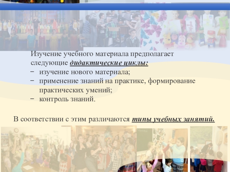 быть разнообразным как по форме (групповые и индивидуальные, теоретические и практические, исполнительские и творческие занятия), так и по содержанию;