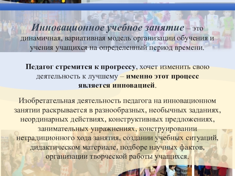Слайд 5Инновационное учебное занятие – это динамичная, вариативная модель организации обучения и