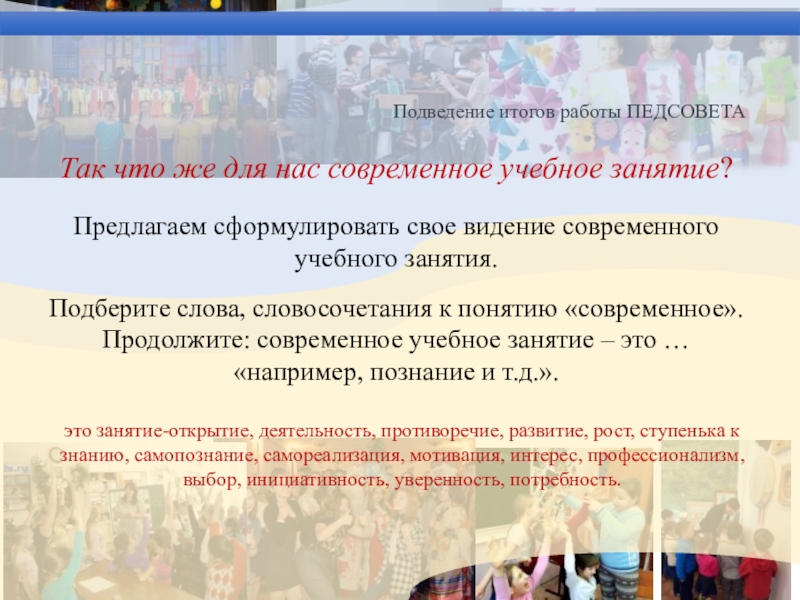 это занятие-открытие, деятельность, противоречие, развитие, рост, ступенька к знанию, самопознание, самореализация, мотивация, интерес, профессионализм, выбор, инициативность, уверенность, потребность.