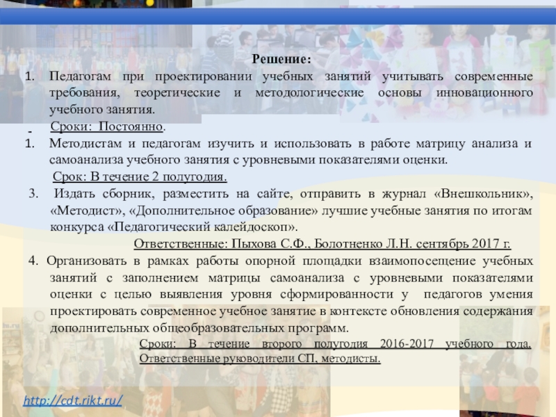 Сроки: В течение второго полугодия 2016-2017 учебного года. Ответственные руководители СП, методисты.