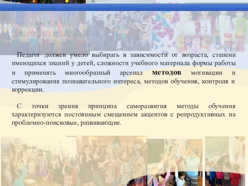 Слайд 31Педагог должен умело выбирать в зависимости от возраста, степени имеющихся знаний