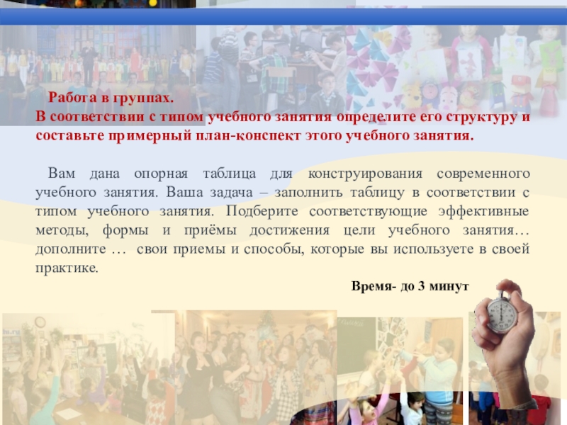 либо занимать свободное время, наполняя учащихся только знаниями умениями и навыками, либо давать такое учебное занятие, которое развивает понимание этих знаний, умений, навыков, создает условия для порождения их ценностей и смыслов, создание нового собственного продукта деятельности.