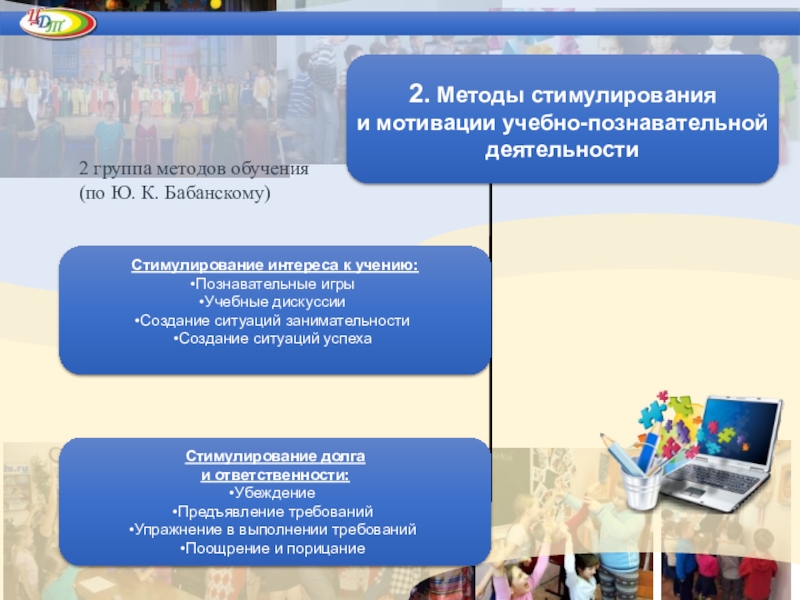 у детей, сложности учебного материала формы работы и применять многообразный арсенал методов мотивации и стимулирования познавательного интереса, методов обучения, контроля и коррекции.