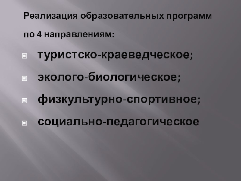 Реализация образовательных программпо 4 направлениям: туристско-краеведческое; эколого-биологическое; физкультурно-спортивное; социально-педагогическое