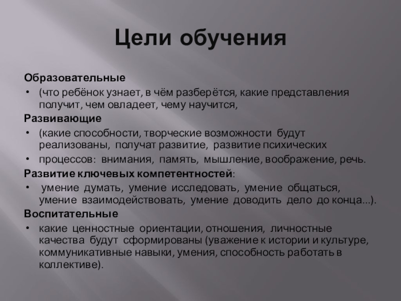 Цели обученияОбразовательные(что ребёнок узнает, в чём разберётся, какие представления получит, чем овладеет, чему научится, Развивающие (какие способности, творческие возможности будут реализованы, получат развитие, развитие психических процессов: внимания, память, мышление, воображение, речь. Развитие ключевых компетентностей: умение думать,