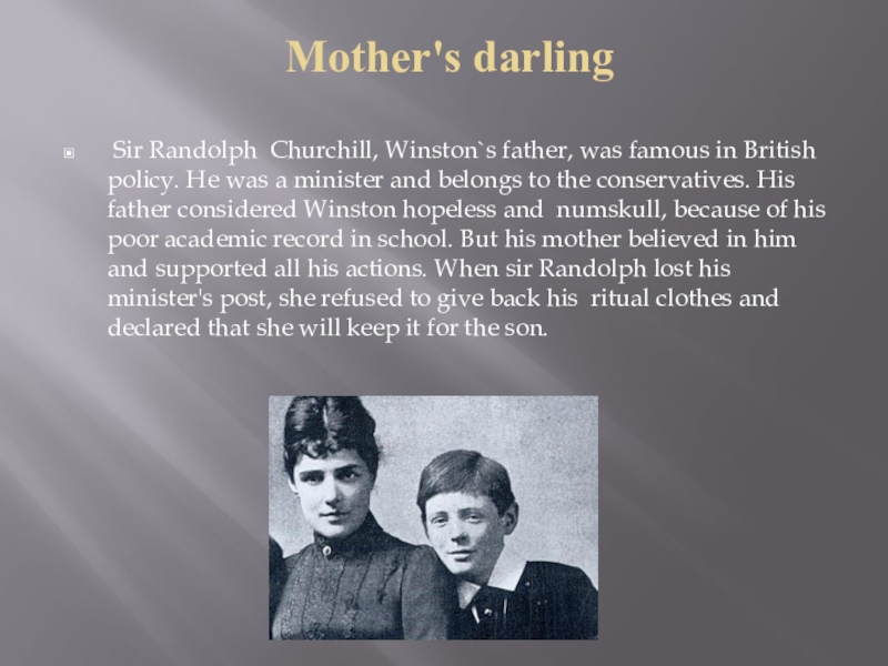 British policy. He was a minister and belongs to the conservatives. His father considered Winston hopeless and numskull, because of his poor academic record in school. But his mother believed in him and supported all his actions. When sir Randolph lost his minister's post, she refused to give back his ritual clothes and declared that she will keep it for the son.